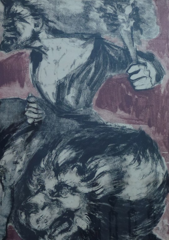 Among his few paintings here, there is a vigorous, dramatic Crucifixion, but the four oils forming an incomplete series of the Plagues of Egypt are much less impressive. Colour, for some reason, weakens his work, as does the medium of oil paint. His strength lies in line, in boldness of gesture and silhouette. His talent is a public one, I would say, and he likes to work on a large scale. It is not surprising that his drawings have been used to illustrate a series of religious programmes on STV. They are also on show but they pale beside his splendid monotypes.